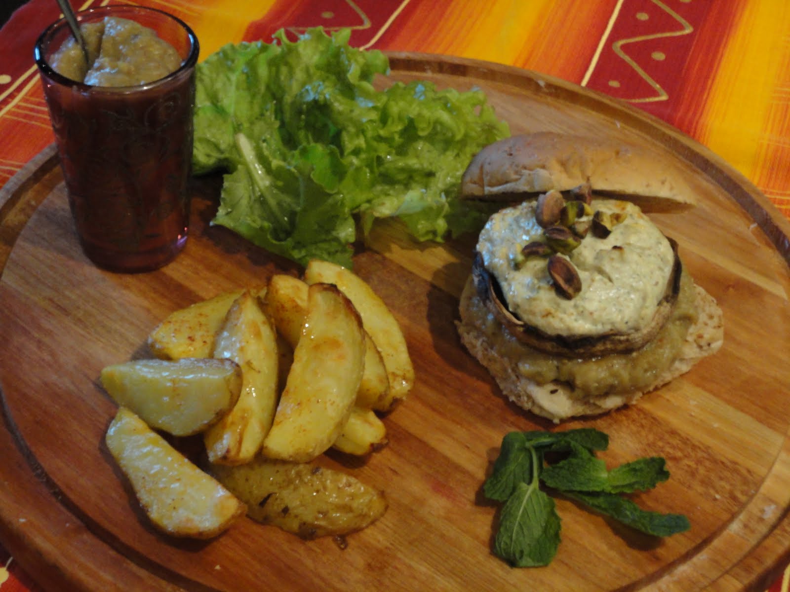 I served the Le Chic Macs with wholewheat buns, spooned the spiced dip over and added the stuffed mushrooms on top and a plain green salad.