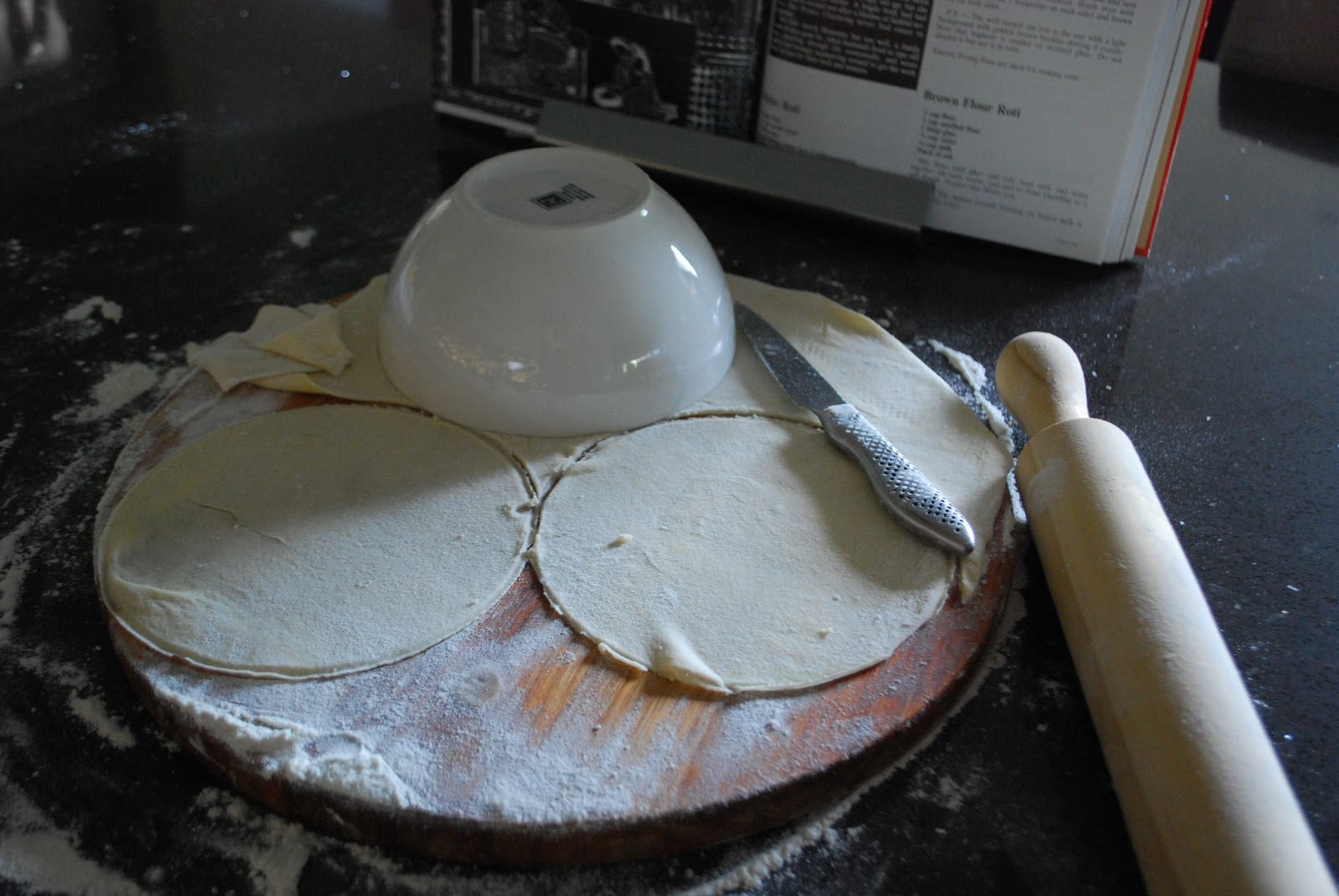 I used a bowl, to cut out the roti rounds! Besides, I wanted a petite sized bread. Excuses? Who, me?